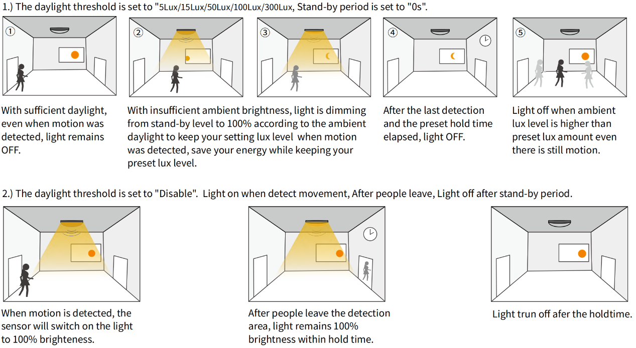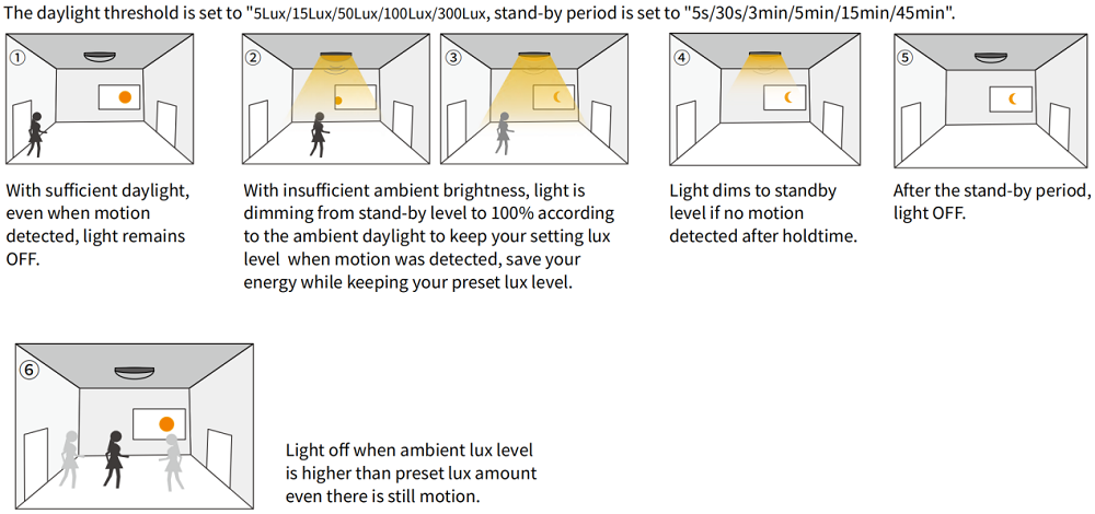 ڈوئل پی ڈی ٹکنالوجی کی بدولت ، MC004-S02R سینسر قدرتی روشنی اور مصنوعی ایل ای ڈی لائٹ کے درمیان فرق بتا سکتا ہے۔ سینسر آپ کے لائٹ فکسچر کو چالو کرے گا جب محیطی روشنی ترتیب کی قیمت سے کم ہو ، یہاں تک کہ کوئی تحریک بھی نہیں پائی جاتی ہے۔ جب محیطی روشنی ترتیب کی قیمت پر منحصر ہوتی ہے تو ، سینسر لائٹ فکسچر کو بند کردے گا یہاں تک کہ اگر اب بھی حرکت موجود ہے۔