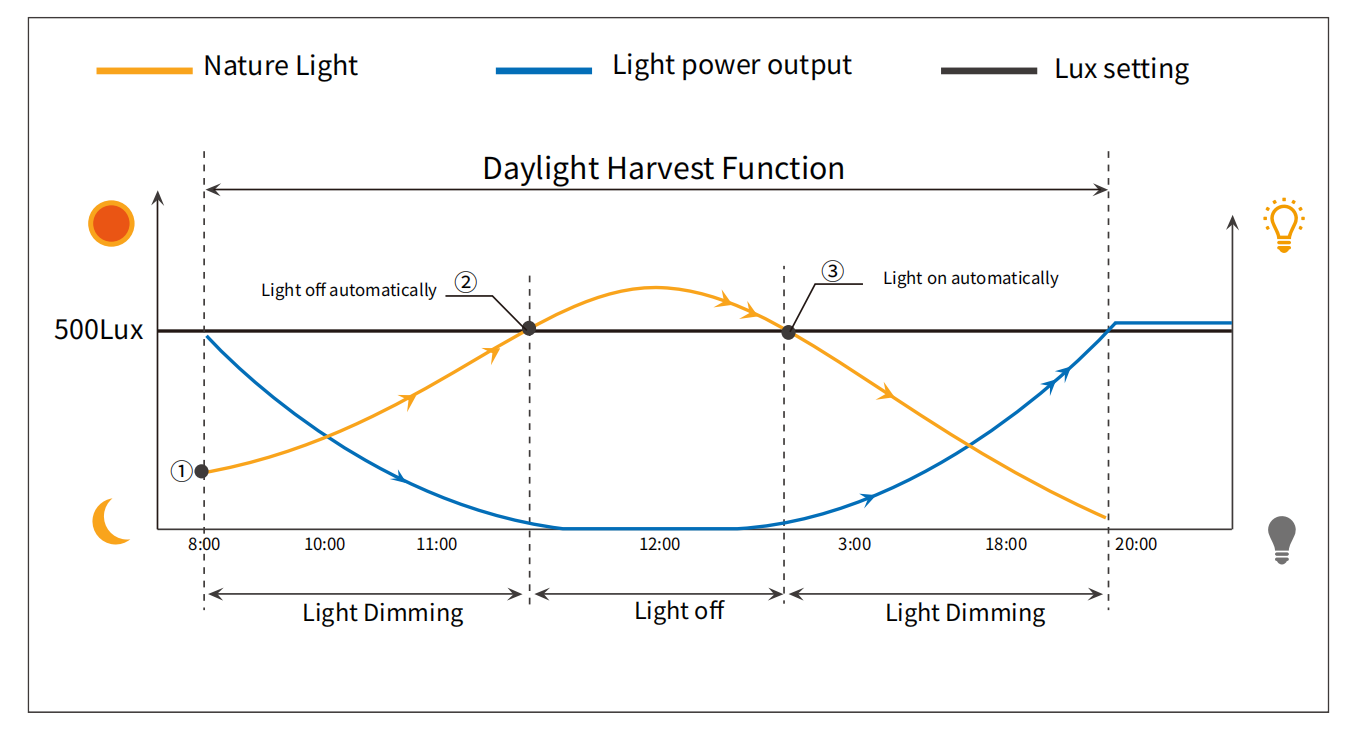 1. تحریک کا پتہ لگانا + دن کی روشنی کی فصل + لکس آن/آف فنکشن