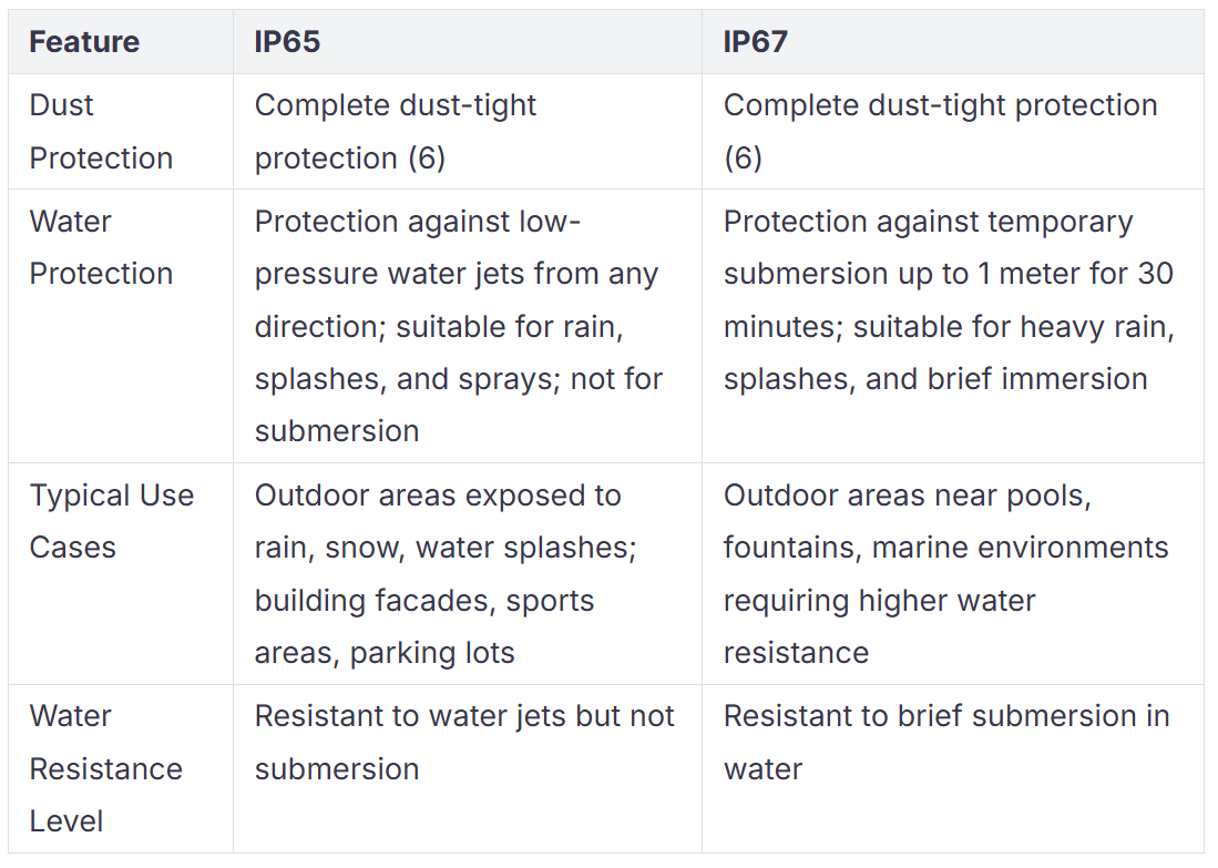 جب ایل ای ڈی ویدر پروف لائٹنگ کو چنتے ہو تو ، اس پر توجہ مرکوز کریں کہ واٹر پروف کتنا ہے۔ آئی پی کی درجہ بندی سے پتہ چلتا ہے کہ روشنی کتنی اچھی طرح سے دھول اور پانی کو برقرار رکھتی ہے۔ زیادہ تر بیرونی جگہوں کے لئے ، کم از کم IP65 کے ساتھ لائٹس چنیں۔ یہ درجہ بندی تمام دھول کو روکتی ہے اور بارش یا چھڑکنے سے بچاتی ہے۔ اگر آپ سمندر کے قریب رہتے ہیں یا تالابوں کے ذریعہ لائٹس رکھتے ہیں تو آپ کو مضبوط تحفظ کی ضرورت ہے۔ IP67 لائٹس تھوڑے وقت کے لئے پانی کے نیچے رہنے کو سنبھال سکتی ہیں۔ وہ گیلے یا سمندری علاقوں کے لئے اچھے ہیں۔