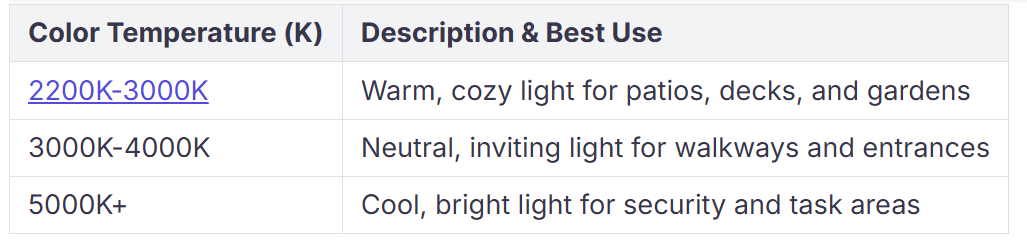 صحیح رنگ کے درجہ حرارت کو منتخب کرنے سے آپ کی جگہ کیسے محسوس ہوتی ہے اور کام کرتی ہے۔ گرم روشنی ، 2200K سے 3000K تک ، مقامات کو آرام دہ اور خوش آئند محسوس کرتی ہے۔ اس کا استعمال پیٹیوس ، ڈیک ، یا باغات کے لئے کریں جہاں آپ آرام کرنا چاہتے ہیں یا دوستوں کے ساتھ تفریح کرنا چاہتے ہیں۔ غیر جانبدار سفید ، 3000K اور 4000K کے درمیان ، واضح روشنی دیتا ہے جو زیادہ روشن نہیں ہے۔ یہ واک ویز اور داخلی راستوں کے ل good اچھا ہے تاکہ آپ اپنی آنکھوں کو تکلیف پہنچائے بغیر اچھی طرح دیکھ سکیں۔ ٹھنڈا سفید ، 5000K سے اوپر ، بہت روشن اور تیز ہے۔ اس کو سیکیورٹی لائٹنگ یا دھبوں کے لئے استعمال کریں جہاں آپ کو ہر چیز کو واضح طور پر دیکھنے کی ضرورت ہے۔