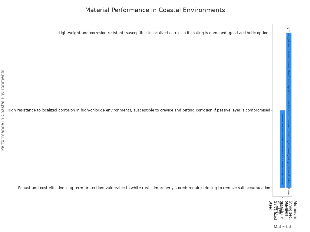 مینوفیکچررز لائٹس کو زیادہ دیر تک بنانے کے لئے پاؤڈر کوٹ ختم اور مہر بند کور کا استعمال کرتے ہیں۔ یہ خصوصیات موسم سے بچنے والے موسم سے بچنے والے طوفانوں ، گیلے ہوا اور نمک کے سپرے سے بچنے میں مدد کرتی ہیں۔ آپ دیکھ سکتے ہیں کہ نیچے چارٹ میں سمندر کے قریب مختلف مواد کس طرح کام کرتا ہے: